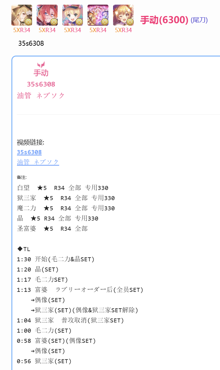 目录 搜索 展开 👧幼女之家⚔️跨阶段满补🚦三阶段贯通🟢一王🔵二王🟡三王🟠四王🟣五王⏱️常用尾刀🐦鸟之家🚥低阶段贯通⏩四阶段半自动 暂无相关搜索结果! 阅读次数:381 本文档使用 MinDoc 发布 ⏱️常用尾刀 D1尾刀D2尾刀D3尾刀D4尾刀D5尾刀说明:D1尾刀(作业)D2尾刀半自动◆TL(35s6509)1:30 开始(狱三家以外)1:21 晶(SET)1:17 雪菲(SET) →511(SET)1:16 狱三家 普攻取消(狱三家SET)全员SET(这里开始操作无)1:15 偶像(SET)1:08 狱三家(SET)1:01 偶像(SET)1:00 511(SET) →狱三家(SET)D3尾刀(作业)D4尾刀(作业)D5尾刀(作业)作者:背包 创建时间:2024-09-27 22:51最后编辑:prpr 更新时间:2024-11-26 18:56 上一篇: 🟣五王下一篇: 🐦鸟之家